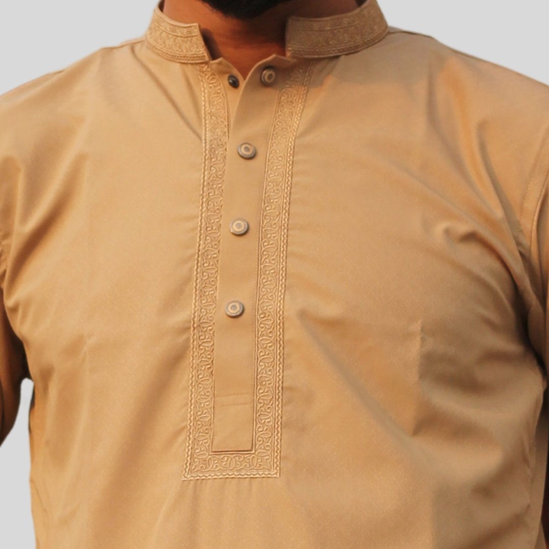 Crafted from luxurious jacquard fabric, this Pakistani textured Panjabi embodies refined tradition with a contemporary edge. The light beige tone highlights intricate weaving, while the buttoned placket and detailed collar stitching add subtle sophistication. Perfect for Eid, weddings, or formal gatherings, this Panjabi offers both comfort and prestige, making it an essential piece for the modern gentleman’s wardrobe.